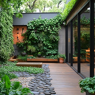 Living walls and hanging planters utilize vertical space to grow herbs, improving air quality in compact urban courtyards.