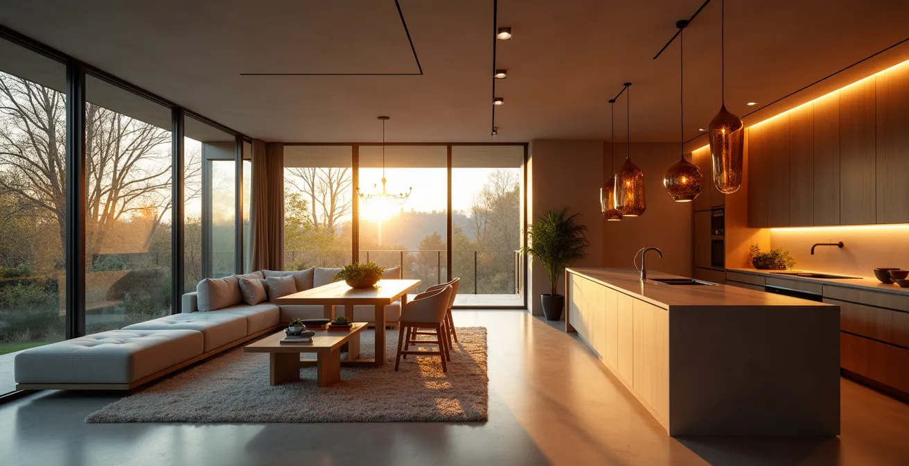 Lighting is one of the most powerful and underutilized tools for creating “walls” without walls. Instead of thinking of one overhead light for the entire space, a layered lighting strategy using multiple circuits allows you to “paint” with light, creating distinct zones that can appear and disappear on command. The key is to treat each functional area—living, dining, kitchen—as its own room deserving of a dedicated lighting plan. This involves using a mix of ambient, task, and accent lighting for each zone.